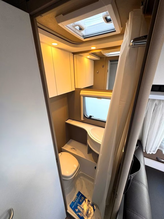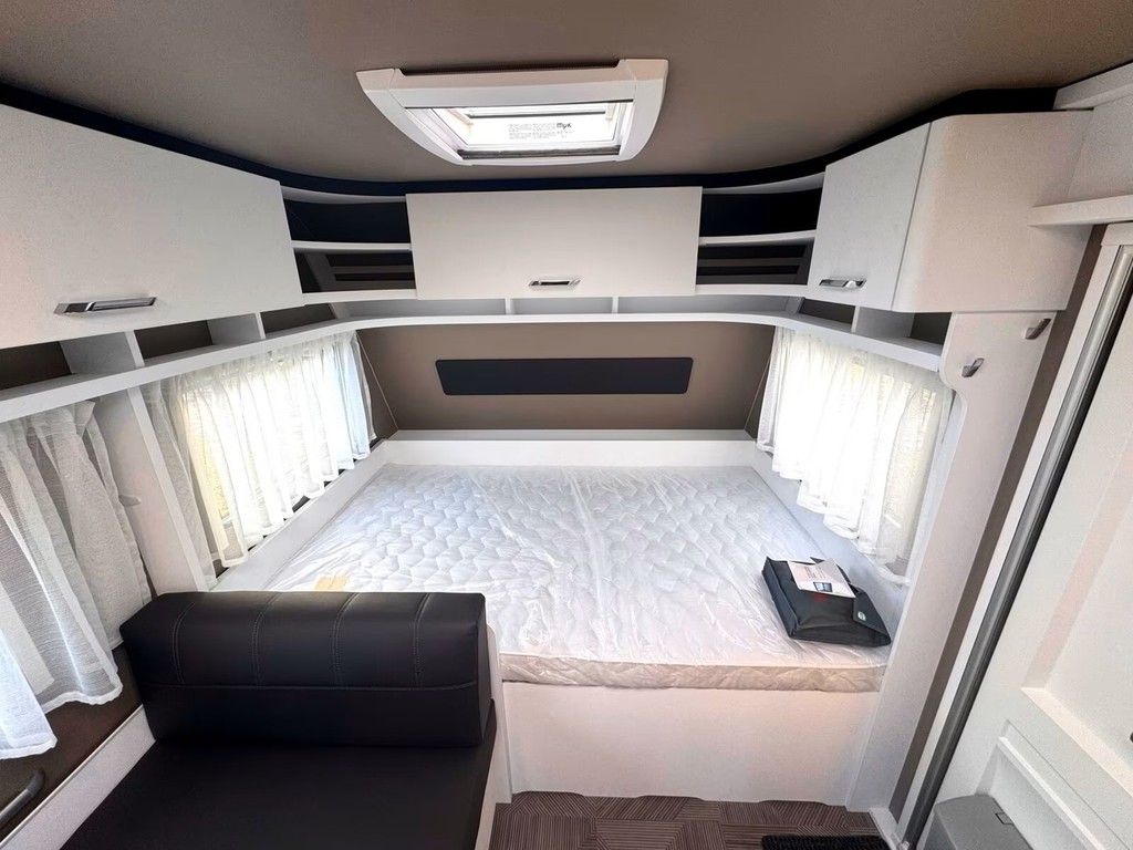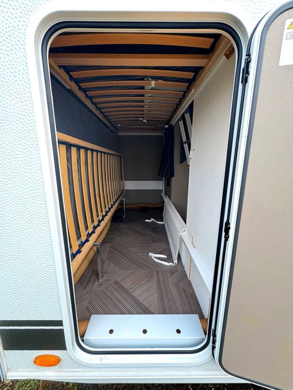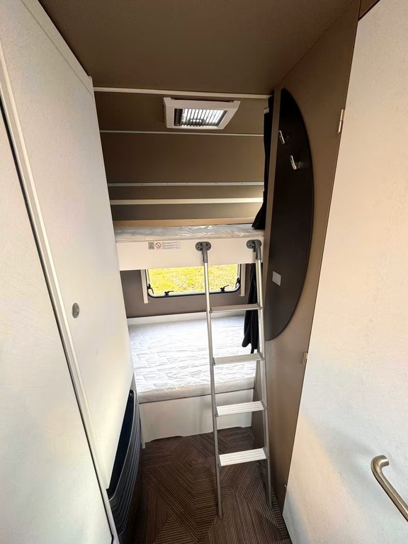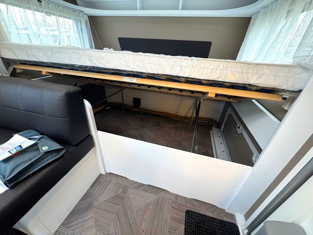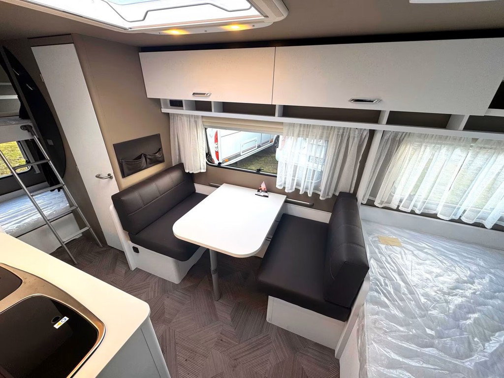 Er hat im hinteren Bereich das Doppelstock Bett für 2 Personen sowie in der Mitte eine Sitzgruppe. Im vorderen Bereich befindet sich ein Französisches Festbett mit viel Stauraum und die Toilette. Der