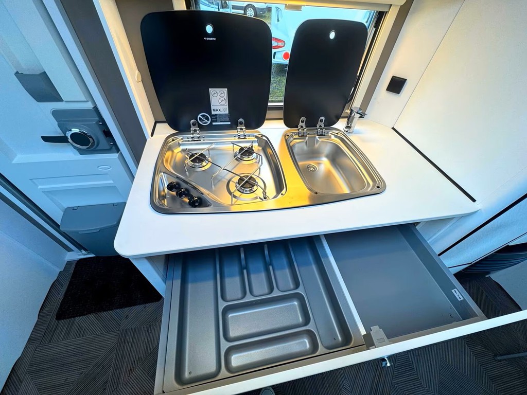 Schlafraum kann wie auf den Bidern zu sehen ist auch komplett abgetrennt werden. Zudem ist eine Gas Kochstelle mit 3 Flammen und ein Waschbecken im mitleren Bereich. Also alles was den Urlaub zu