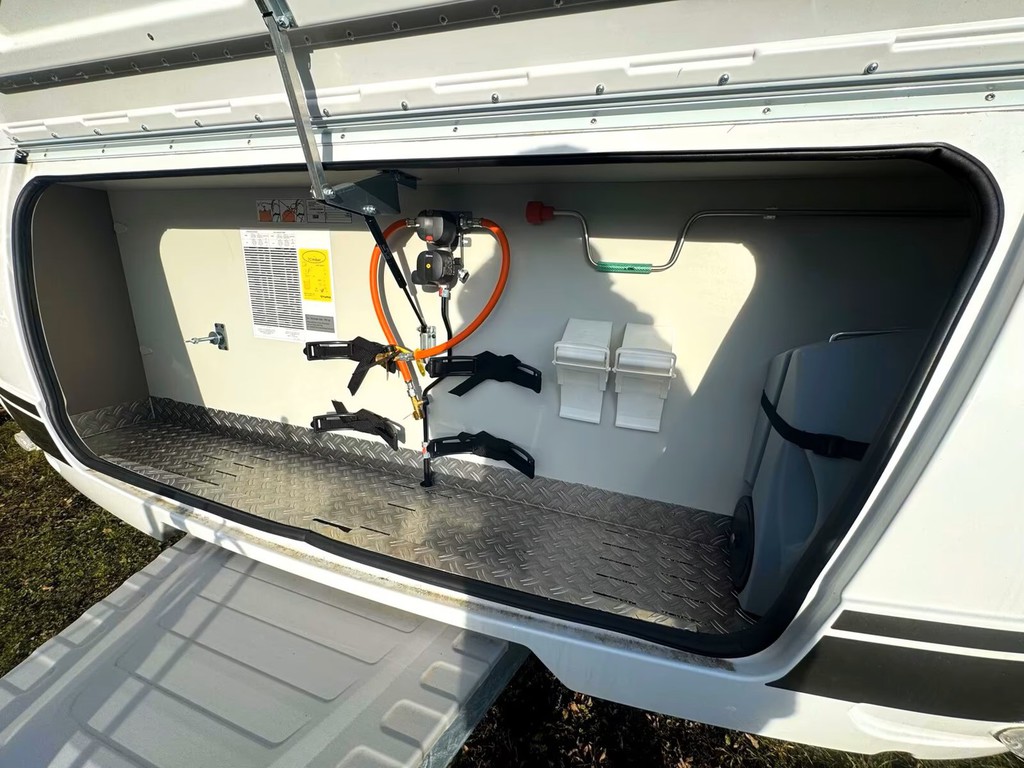 Diese beinhaltet eine ausführliche Einweisung in das Fahrzeug und alle mitgeführten Geräte. Sie erhalten zudem eine 11Kg Gasflasche, alle Kabel und Adapter inkl. CEE-Adapter, Sanitärzusätze,