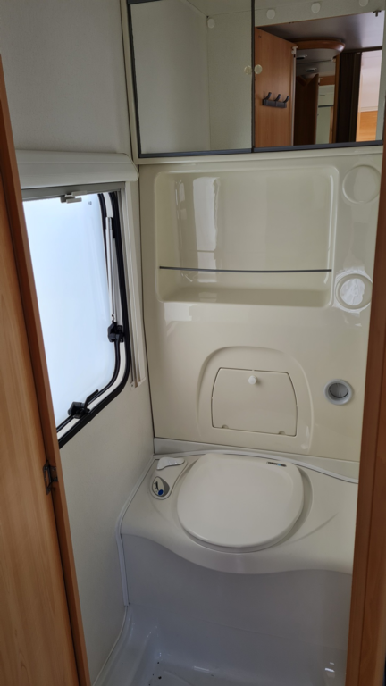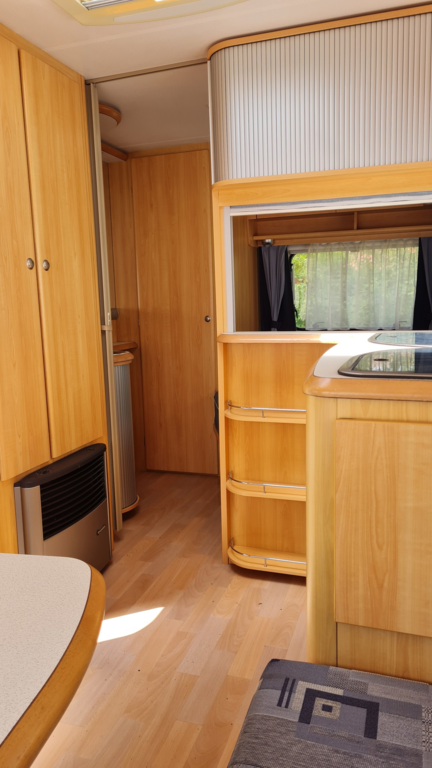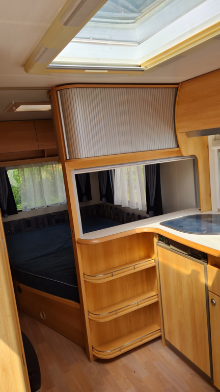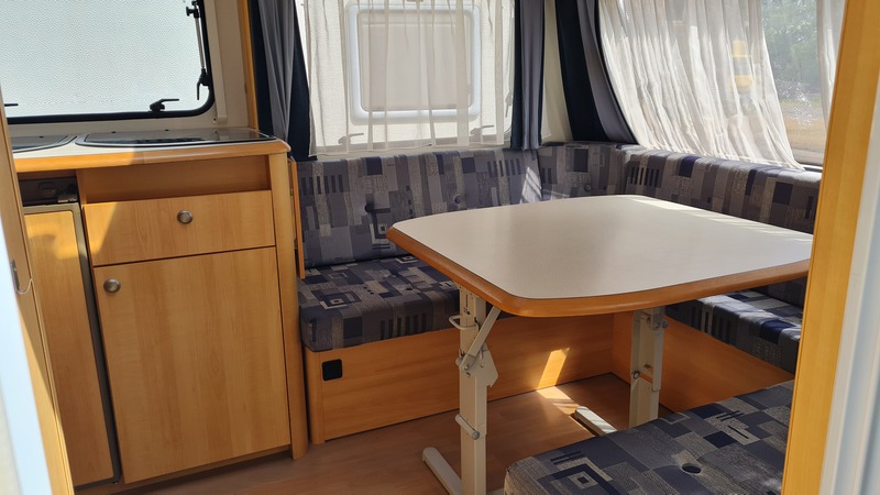 Er hat im vorderen Bereich eine Rundsitzecke die zum Schlafplatz für 2 Personen umgebaut werden kann. Im hinteren Bereich befindet sich ein Französisches Festbett mit viel Stauraum und die Toilette.